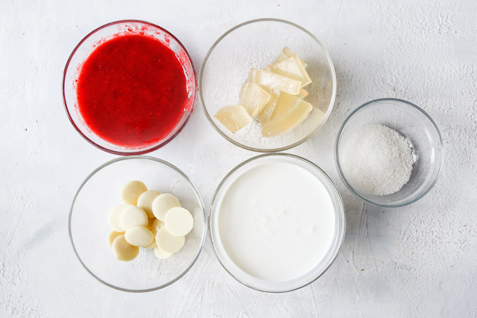 Когда начинка застыла и бисквит готов, приступайте к приготовлению мусса. Вам понадобятся пюре клубники, сахар, белый шоколад, сливки 33-35 % и листовой желатин (у меня желатиновая масса). Замочите листовой желатин в холодной воде. Если используете порошковый, Вам понадобится на 15 % меньше. Замочите его в пропорции 6 гр холодной воды на 1 гр желатина.
