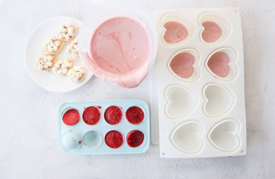 Перелейте начинку в формы. Для пирожных я часто использую силиконовую форму для кейкпопсов. Заморозьте конфи. Такие маленькие полусферы, заморозятся за пару часов.
