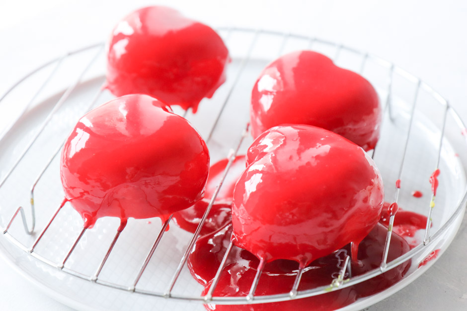 В отличие от зеркальной глазури на шоколаде, это сразу схватывается и превращается в слой мармелада. Если температура глазури будет ниже 40 С, то есть вероятность, что глазурь равномерно не распределится. Ниже для примера я залила одно пирожное горячей глазурью 48 С, а второе пирожное - глазурью 35 С. Так что будьте внимательны. Если глазурь излишне остынет, прогрейте ее. Вкус глазури - прекрасное преимущество перед другими видами глазури. У нее насыщенный вкус пюре, не излишнее количество сахара. Для всех фруктовых и ягодных десертов рекомендую использовать эту глазурь.